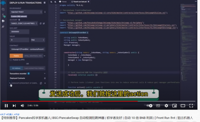 这个视频里面有很多都是一些很基本的且无关紧要的操作,无非就是教你怎么去部署一个合约,代码本身是没有什么问题的,问题就在于这个合约里面,这个合约部署成功好以后,他需要执行一个命令,就是他在教程里面最后说的需要你去点一下action。