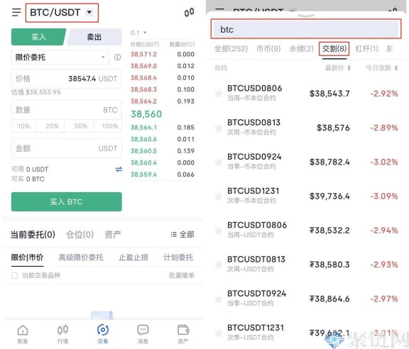 2、在交易页面点击币对右侧的下拉按钮,在搜索框输入币种,在保证金交易处选择交割,选择合约周期为当周、次周、当季或次季的币本位合约。
