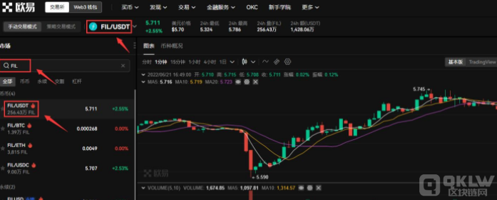 第二步:搜索币种简称,FIL点击FIL/USDT交易对,可以看到FIL实时行情。
