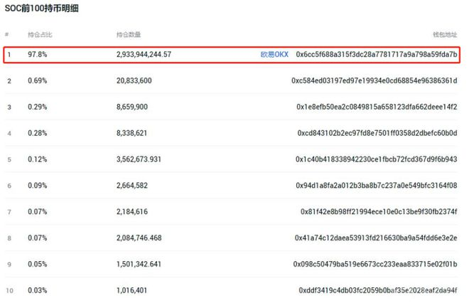 SOC是典型的概念币,通过重大赛事炒作代币价格,本身并无强大的技术与实体支撑,值得一提的是SOC的最大的庄家是OKEX,持币率高达97.8%,基本就是想让它飞可以随时开启火箭模式,想割韭菜也是分分钟要你命。