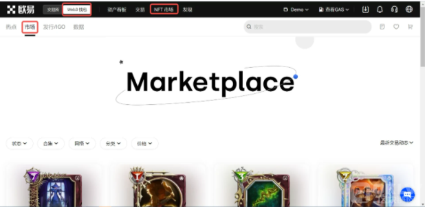 1、登录欧易官网,点击首页上方导航栏【Web3钱包】—【NFT市场】—【市场】,您可以使用搜索/筛选功能查找对应的NFT。