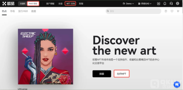1、登录欧易官网,点击首页上方导航栏【Web3 钱包】—【NFT市场】—【创作NFT】。