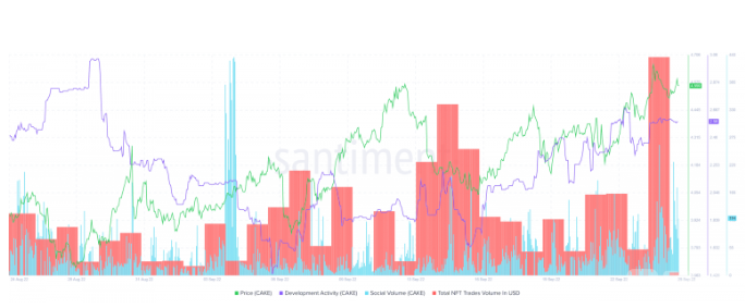 根据Santiment的说法,该平台的开发活动已经显著上升,NFT 交易的总数也是如此。这使人们重新相信到今年年底可能飙升至6.762 美元。