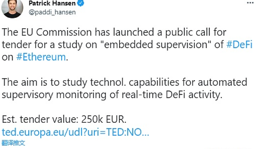 10月10日消息,Circle欧盟战略与政策总监Patrick Hansen表示,欧盟委员会已经公开招标对以太坊的DeFi进行嵌入式监管研究,旨在研究实时DeFi活动的自动监控技术,招标金额25万欧元。